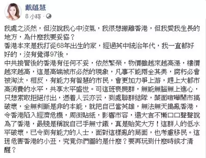 戴藴慧在貼文中表示,「我很想搬離香港,但我愛我生長的地方,為甚麼我要妥協?香港本來是我打從68年出生的家,經過英中統治年代,我一直都好好的,沒有覺得97後,中共接管後的香港有任何不妥,依然繁榮。」