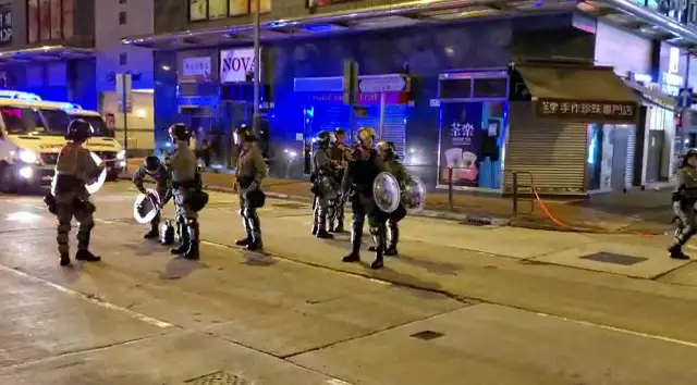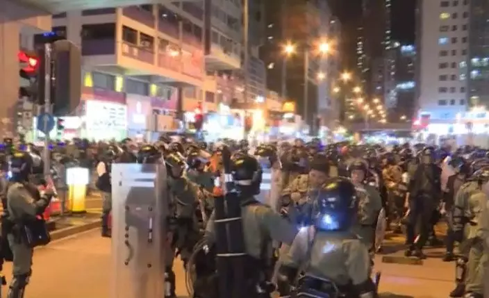 旺角警署外晚上9時20分左右,大批警車到太子道西與彌敦道交界增援。身穿綠色防暴服的警察組成防線,防暴警察手持警棍、盾牌,警告示威者及記者返回行人路,並沿彌敦道快步向南推進,並拆除路障,而示威者則以激光射向警員。立法會議員張超雄亦在場協調,並站在示威者與警員之間。晚上9時40分,防暴警察以警棍打向示威者,部分人被壓在地上。警方沿彌敦道推進至亞皆老街街口,速龍小隊成員手持胡椒球槍,與示威者對峙。另外,亦有部分沒有戴上口罩的旺角居民在場旁觀。