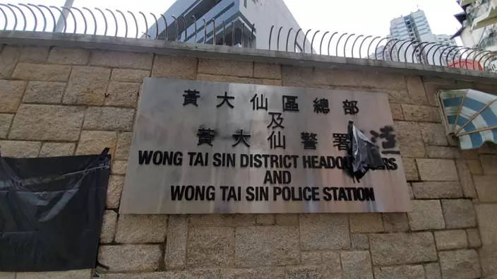 一批警員早上到黃大仙警署及紀律部隊宿舍,準備處善後工作。現場所見,出入口鐵閘被綁上鐵鏈,對講機和旁邊停車場閘口損毀,外圍的塗鴉則暫以膠袋封著。