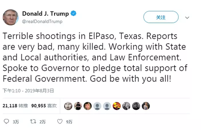 在沃爾瑪發生嚴重槍擊案後,特朗普先發推文,形容槍擊案情況很糟糕,有很多人遇難,他正與州與地方政府,及執法部門合作應對。