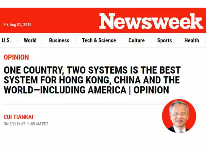 中國外交系統接連猛轟外國勢力搞局香港,繼中國駐英大使劉曉明出招後,駐美國大使崔天凱在美國《新聞週刊》發表題為《堅持一國兩制,維護香港繁榮穩定》的署名文章,指責國際上有人不懷好意,企圖把香港變成攻擊搞亂整個中國的橋頭堡。