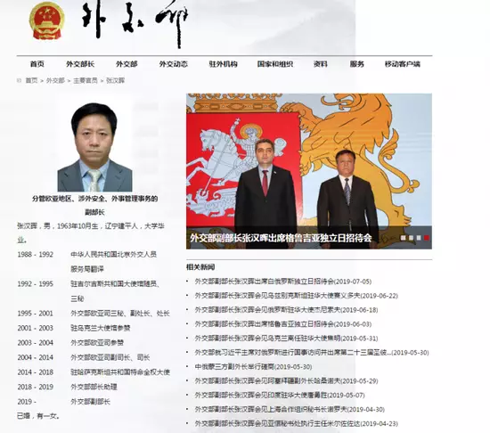 北京青年報記者注意到,外交部官網近日更新,外交部副部長張漢暉已不在「主要官員」一列。