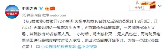 [從3樓敲到6樓敲開72個房間 火場中疏散16名群眾後消防員累吐]8月3日,江西九江火車站附近一餐館發生火災,火勢蔓延至隔壁賓館。三名消防員沖入火場,共疏散出16名被困人員。一小時後,明火被撲滅 ,無人員傷亡,而消防員喻雨涵因進行高強度搜救時吸入濃煙,走出火場後便開始嘔吐。為每一位烈火英雄點贊!