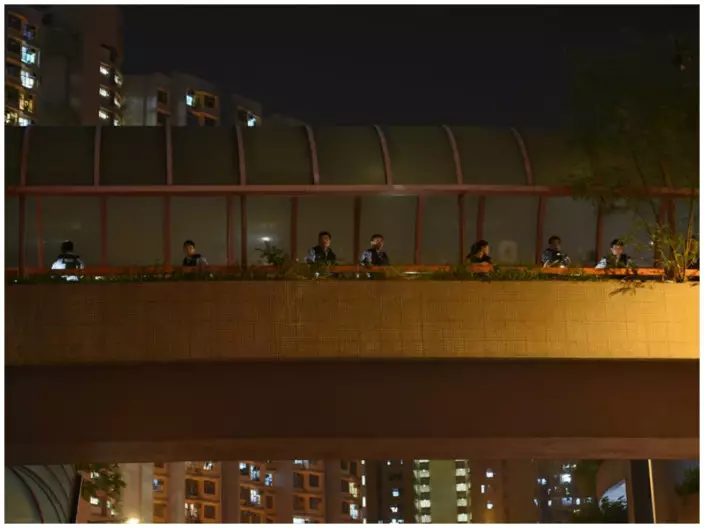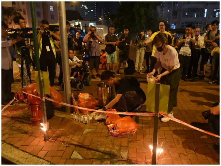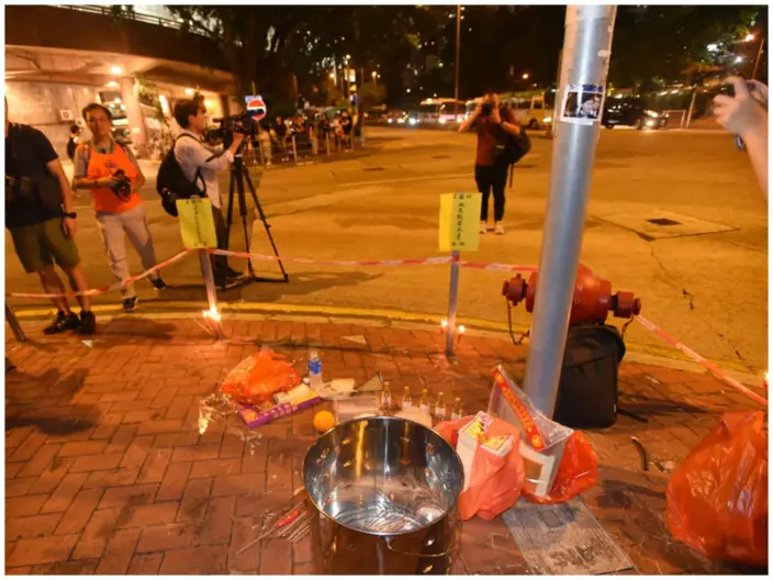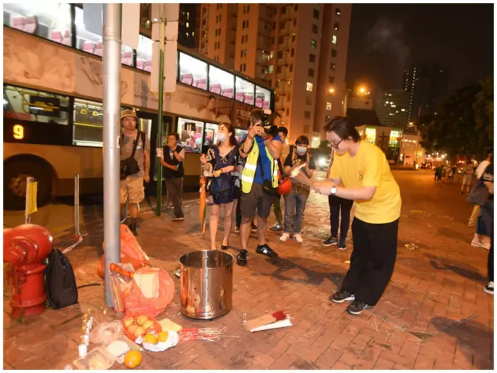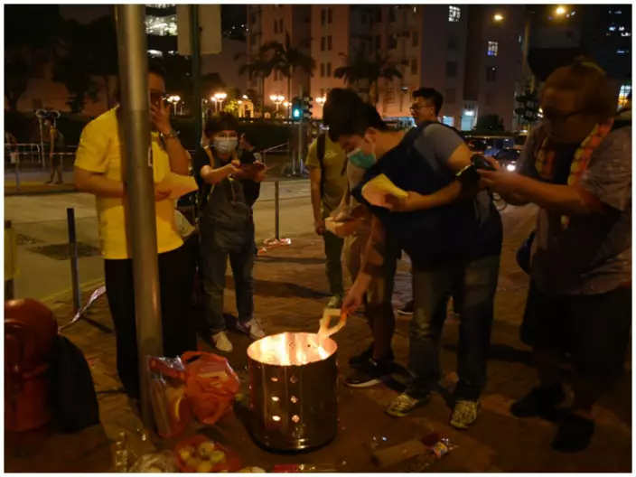 晚上8時後,燒衣市民漸多,約50人在紀律部隊宿舍對出位置聚集,10多名防暴隊在場戒備,也有警員在天橋上監察。市民在地上燃點蠟燭、香燭,又在地上放滿化寶筒、衣錢、溪錢、米酒、橙等祭品。有市民一邊化寶,一邊喊驚「收嘢啦」、「落到下面都要帶委任證呀」。
