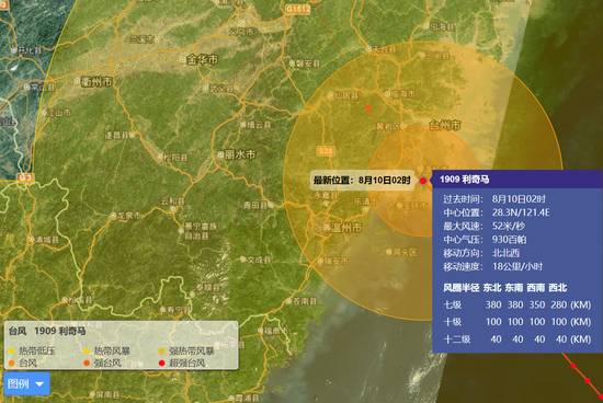8月10日凌晨1時45分左右,超強颱風「利奇馬」正面登陸浙江溫嶺城南鎮,之後將以每小時18公里左右的速度,縱跨台州、金華中部、紹興、杭州東部,在10日晚過湖州太湖,向北偏西方向移動。完成「穿越浙江」這套動作或花費近20小時。
