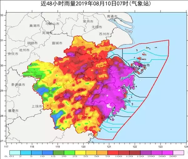 監測顯示,8日08時-10日05時,浙江全省面雨量為105.6毫米,市面雨量較大的有台州225.2毫米、寧波187.9毫米、溫州118.6毫米,累積雨量有7個站超過500毫米,213個站超過250毫米,雨量最大為括蒼山653.4毫米。