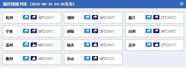 具體來看,今天,浙北及台州、金華地區有暴雨,部分大暴雨,局地特大暴雨;其它地區陰有中到大雨,部分暴雨。白天最高溫度,全省28-30℃;明晨最低溫度,全省25-27℃。