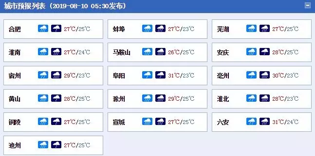安徽省氣象台預計,今天白天到明天早晨,全省陰天有小到中等陣雨或雷雨,其中淮北地區、大別山區、江淮之間東部和江南部分地區暴雨,局部大暴雨。全省偏北風4~5級,陣風8級左右。最高氣溫,淮北西部和沿江西部29-31℃;其他地區27-29℃。明晨最低氣溫,淮北地區22-24℃;淮河以南23-25℃。預計11日,全省陰天大部分地區有陣雨或雷雨,其中沿淮淮北部分地區中到大雨,局部暴雨。