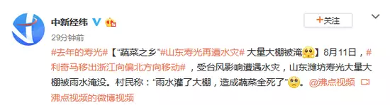 #去年的壽光#[蔬菜之鄉山東壽光再遭水災 大量大棚被淹]8月11日,利奇馬移出浙江向偏北方向移動 ,受颱風影響遭遇水災,山東濰坊壽光大量大棚被雨水淹沒。村民稱:「雨水灌了大棚,造成蔬菜全死了」。