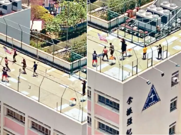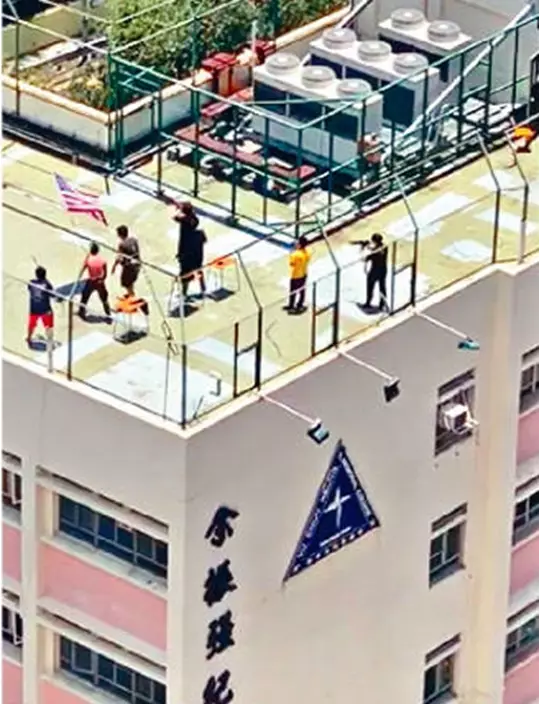 反修例示威近期演變為暴力衝擊,近日有市民拍到在何文田余振強紀念中學的天台,有八名青少年手持氣槍及舉起美國國旗,向前奔跑及呼叫,網上一度盛傳是公然演練衝擊。校方昨發表聲明,證實片中青少年是該校學生及校友,在上周一參與氣槍練習後,一時貪玩的行為,教師當日已跟進指導眾人,校方對事件引起誤會,向公眾致歉。