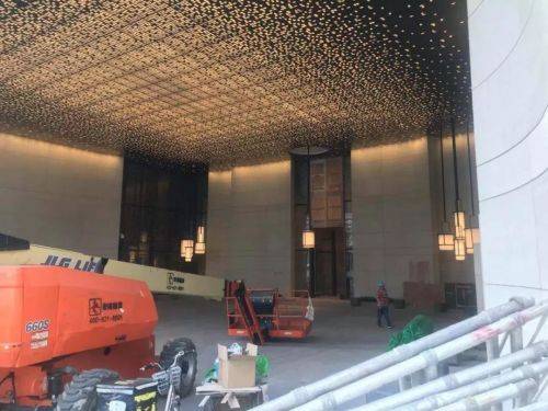 大門門廊的天花燈和掛燈亮起進行測試,抬頭猶如望見璀璨星河。