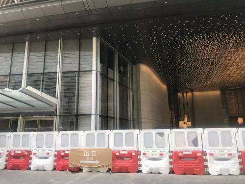 酒店大堂也正處於裝修階段,並且被水馬圍欄層層圍蔽起來。透過圍欄可以看到,幾名裝修工人在圍欄內進行裝修工作,圍欄外圍有安保人員負責看守以及指揮前往大廈的車輛有序進入大廈停車場。除了裝修工人外,全場無行人通過。