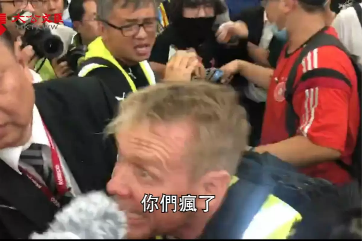 暴力示威者在機場內毆打禁錮內地環球網記者。(AP圖片)