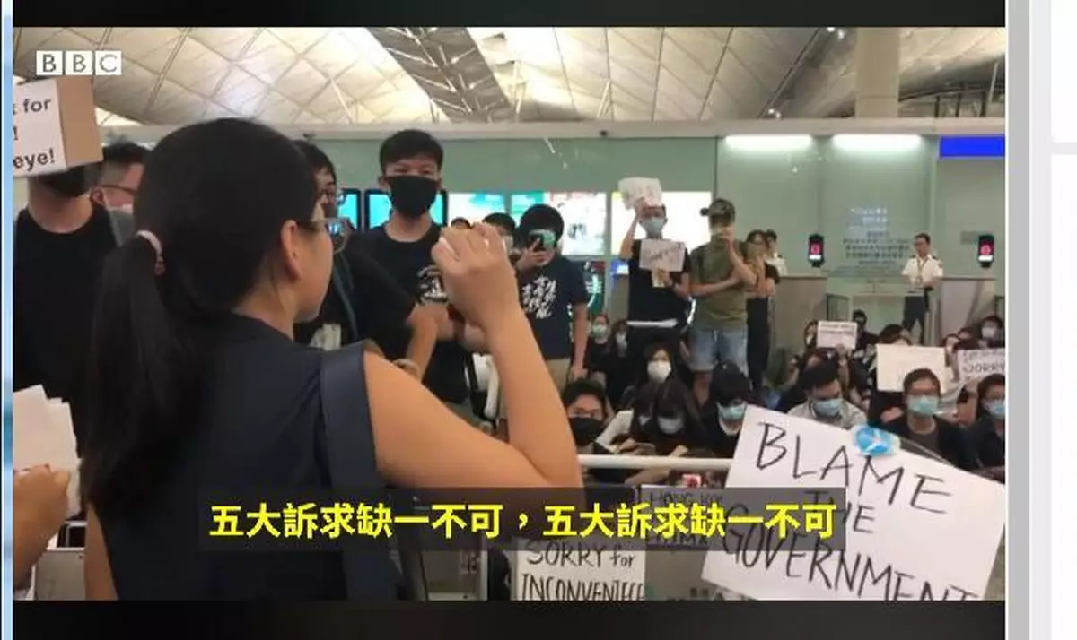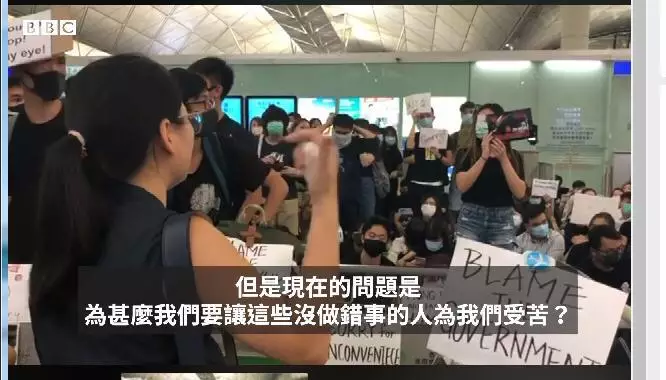 示威者連續第五天聚集香港國際機場,機場昨日已連續第二天暫停辦理航班辦理登機手續。BBC中文網發佈影片,昨天有一名香港女孩試圖勸說示威者不要堵塞機場,讓一名18歲英國少女登機回國,苦苦哀求未果。