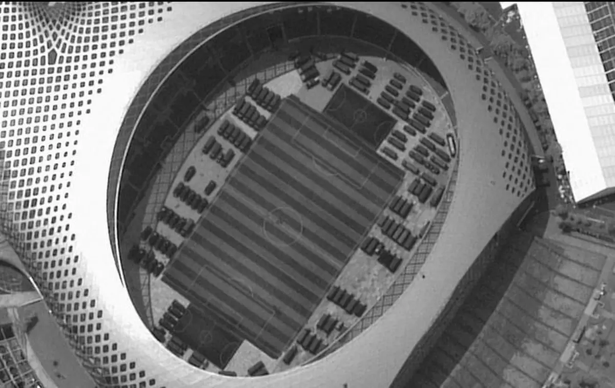 衛星圖片顯示,深圳的體育館停泊大批軍車。美聯社圖片