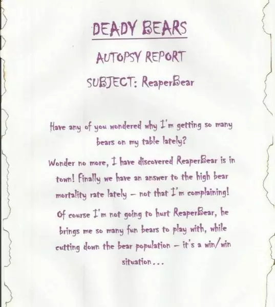Julia非常有心思每隻出售的「亡靈啤啤熊」配備玩具棺材,又設計獨一無二的驗屍報告講述慘死故事,讓買家都對自己獨一無二的玩具愛不釋手。