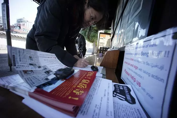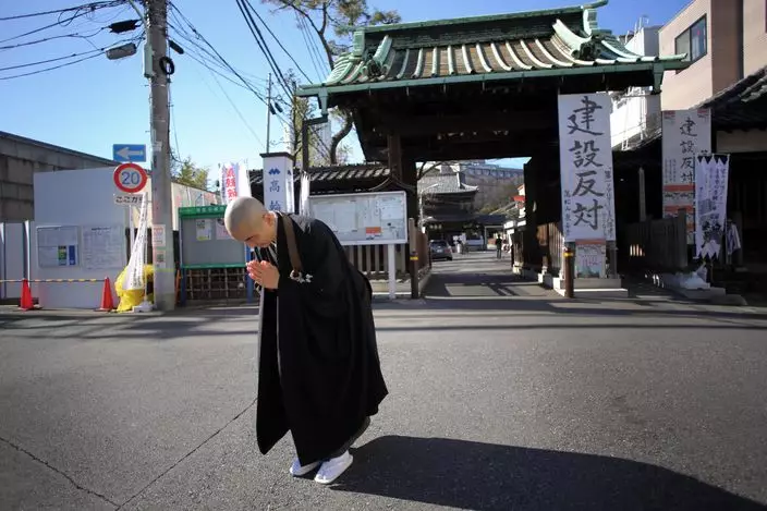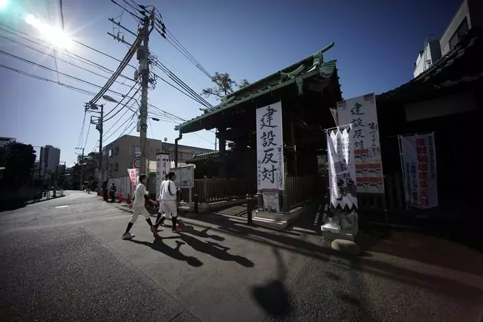 泉岳寺外掛有反對興建大樓的標語。(圖片來源︰AP)