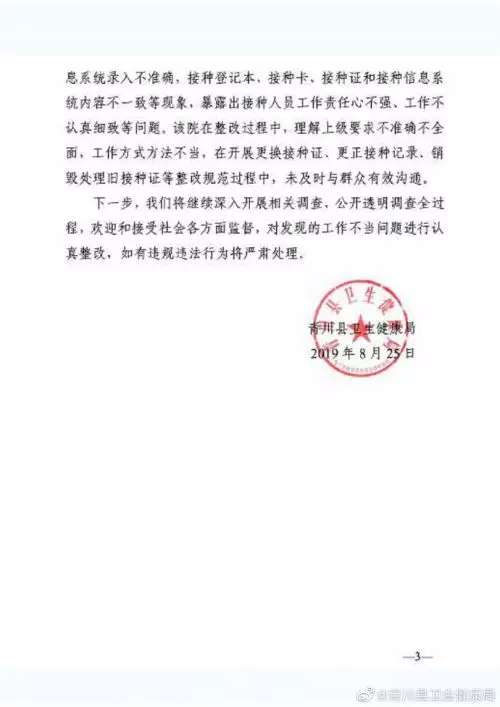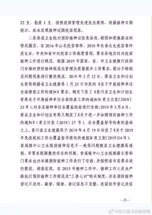 通報指出,青溪衛生院對預防接種證信息塗改、銷毀和更換新證的情況屬實。2019年2月12日,原縣衛生和計劃生育局根據省衛生健康委1月25日印發的《關於開展接種單位全面排查工作的通知》要求,制定下發了《青川縣衛生和計劃生育局關於開展接種單位全面檢查工作的通知》(青衛計發[2019]23號)對全縣接種單位全覆蓋檢查進行安排;2019年3月6日,原縣衛生和計劃生育局又制發了《關於進一步加強預防接種工作的通知》(青衛計發[2019]27號)在全覆蓋督導檢查的基礎之上,青川縣衛生健康局於2019年4月19日印發了《關於2019年免疫規劃工作全覆蓋督導情況的通報》(青衛發[2019]14號)。青溪鎮中心衛生院因接種信息不一致等問題被縣衛生健康局通報,並要求限期整改存在的問題,青溪鎮中心衛生院根據主管部門要求也對本鎮預防接種工作進行了安排,並按照省市縣要求進行整改。
