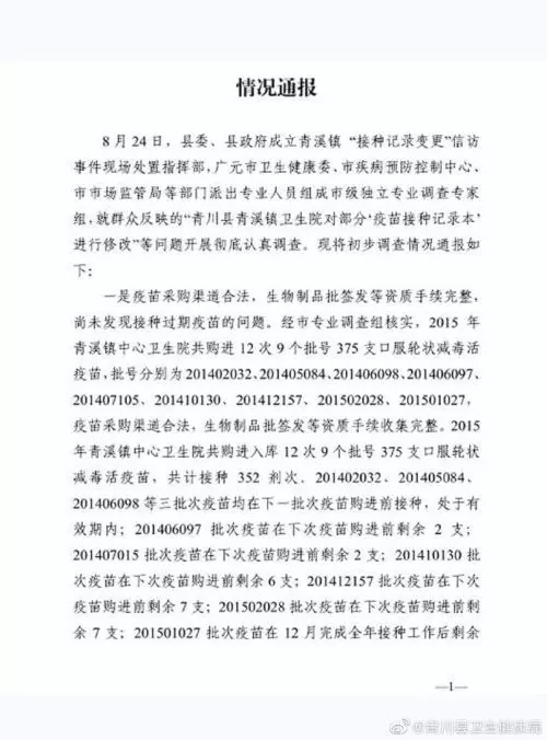 通報稱,8月24日,縣委、縣政府成立青溪鎮「接種記錄變更」信訪事件現場處置指揮部,廣元市衛生健康委、市疾病預防控制中心市市場監管局等部門派出專業人員組成市級獨立專業調查專家組,就群眾反映的「青川縣青溪鎮衛生院對部分“疫苗接種記錄本進行修改」等問題開展徹底認真調查。