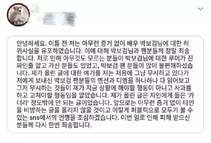 「大家好。兩天前我發佈了關於演員朴寶劍的虛假事實。對此,我要跟朴寶劍先生和他的粉絲們說聲真的對不起。因為我,一些毫不知情的人以為關於朴寶劍先生的謡言是真的,朴寶劍的粉絲們也因此感到很不愉快。