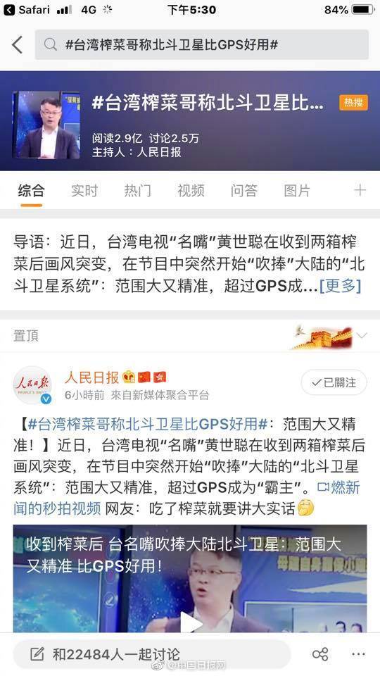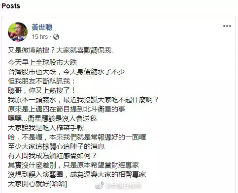 台灣財經專家黃世聰對再次上微博熱搜作出回應。他在臉譜上發文稱,我朋友不斷私訊我:聰哥,你又上熱搜了!我原本一頭霧水,最近我沒說大家吃不起什麼啊?原來是上周四在節目提到北斗衛星的事。嘿嘿。。。衛星應該是沒人會送我。大家說我是吃人榨菜手軟。。哈,不是喔,本來我們就是常報導好的一面喔 至少大家這樣關心這陣子的消息。有人問我成為網紅感覺如何?其實沒什麼差別,只是原本希望當財經專家沒想到誤入演藝圈,成為逗樂大家的相聲專家,大家開心就好。