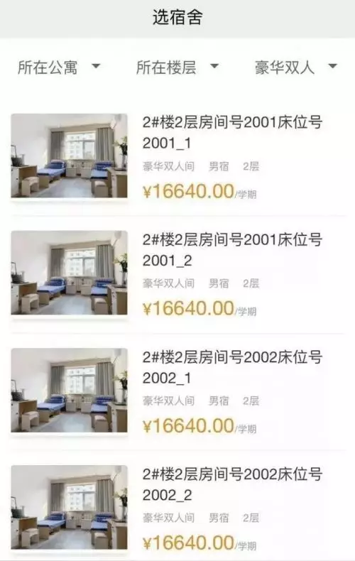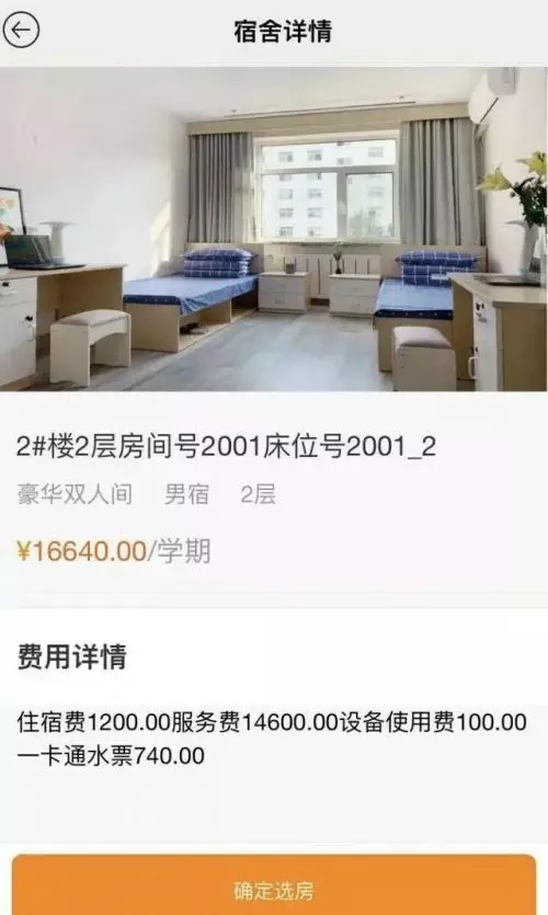 南都記者從學生提供的截圖中看到,一間標為「豪華雙人間」的寢室,價格為16640/學期,費用詳情顯示為住宿費1200元,服務費14600元,設備使用費100元,一卡通水票740元。此外,四人間的寢室標價3840/學期,其中住宿費1200元,服務費1800元。