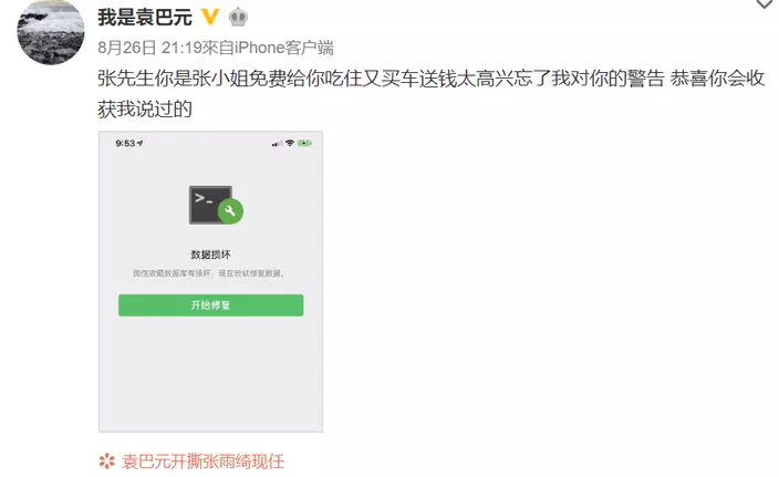 這畫面疑觸動袁巴元的神經,日前在微博發文暗諷張錢豪食軟飯,「張先生你是張小姐免費給你吃住,又買車送錢太高興,忘了我對你的警告,恭喜你會收穫我說過的。」言下之意,似乎張錢豪違反他們達成某些協議,有網民就認為袁巴元做法小氣,見不得前妻過得好。不過,據悉張錢豪是天厚投資Tophold的CEO,但有傳言指他是一個偽富豪。