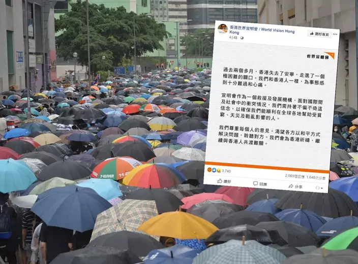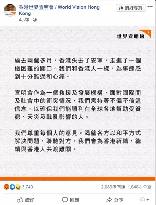 反對修訂《逃犯條例》示威未平息,並引發多次警民衝突。近日有網民不滿部分國際慈善組織未就爭議表態。香港世界宣明會今日在社交網站發聲明,強調需持不偏不倚信念。