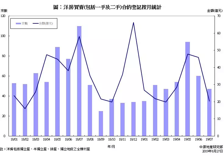 中原地產研究部高級聯席董事黃良昇指出,7月份整體洋房(包括一手及二手)買賣合約登記錄得47宗,總值20.36億元,較6月的60宗及45.91億元,分別下跌21.7%及55.7%。數字是自2019年3月的47宗及19.80億元之後,創四個月新低。