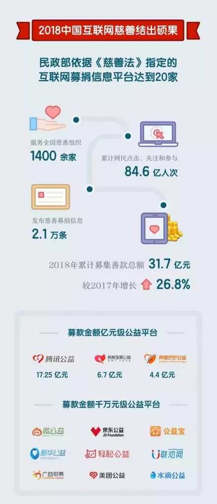去年,民政部依據《慈善法》指定的20家互聯網募捐信息平台,共為全國1400多家公募慈善組織發佈募捐信息2萬餘條,網民點擊、參與超過80億人次,募集善款總額逾30億。
