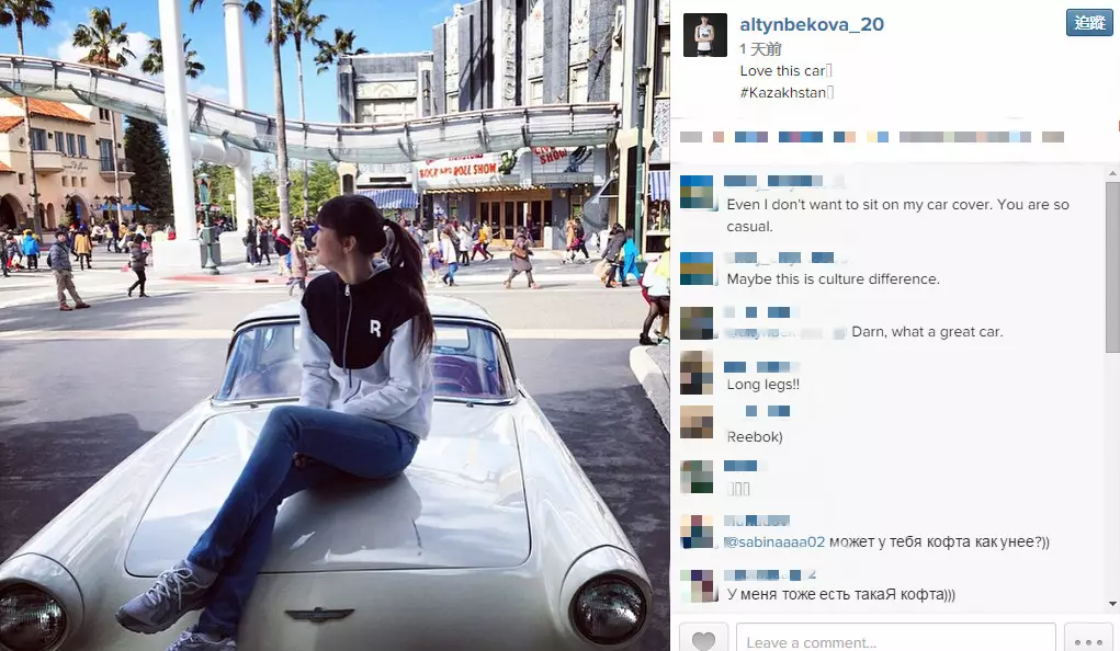 身高182公分,腿長120公分的Sabina去到日本不忘放鬆遊玩。來到美式餐廳區,看到前面停著70年代的古董車,Sabina BB即刻散發少女心,爬到車上拍照,緊身牛仔褲將她的超長美腿展露無疑。