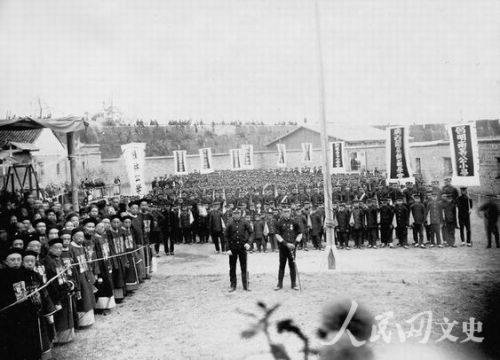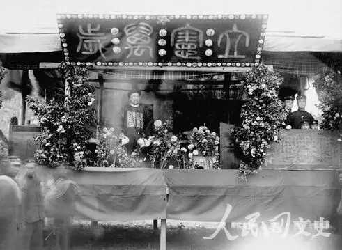 一、1905年廣西桂林的一個官方集會。這是主席台。最矚目的是橫額上的「立憲萬歲」四個大字。當年7月16日,清廷頒旨派大臣出洋考察政治。在此前後,張之洞、袁世凱等重臣奏請清廷實行立憲改革。這張照片說明“立憲”已是官方公開的話題並開始深入人心。(圖1)