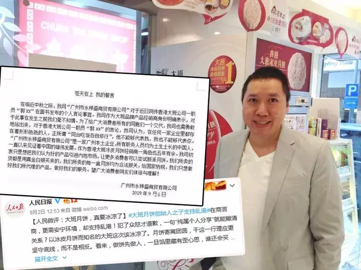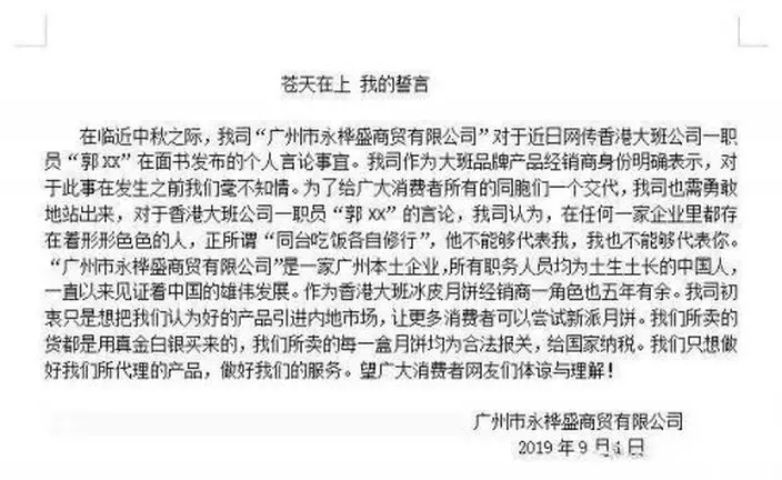 郭勇維的言論繼續在內地發酵,大班冰皮月餅內地總代理廣州市永樺盛商貿有限公司在微博發出文件,提到對郭勇維的言論完全不知情,並聲明澄清。