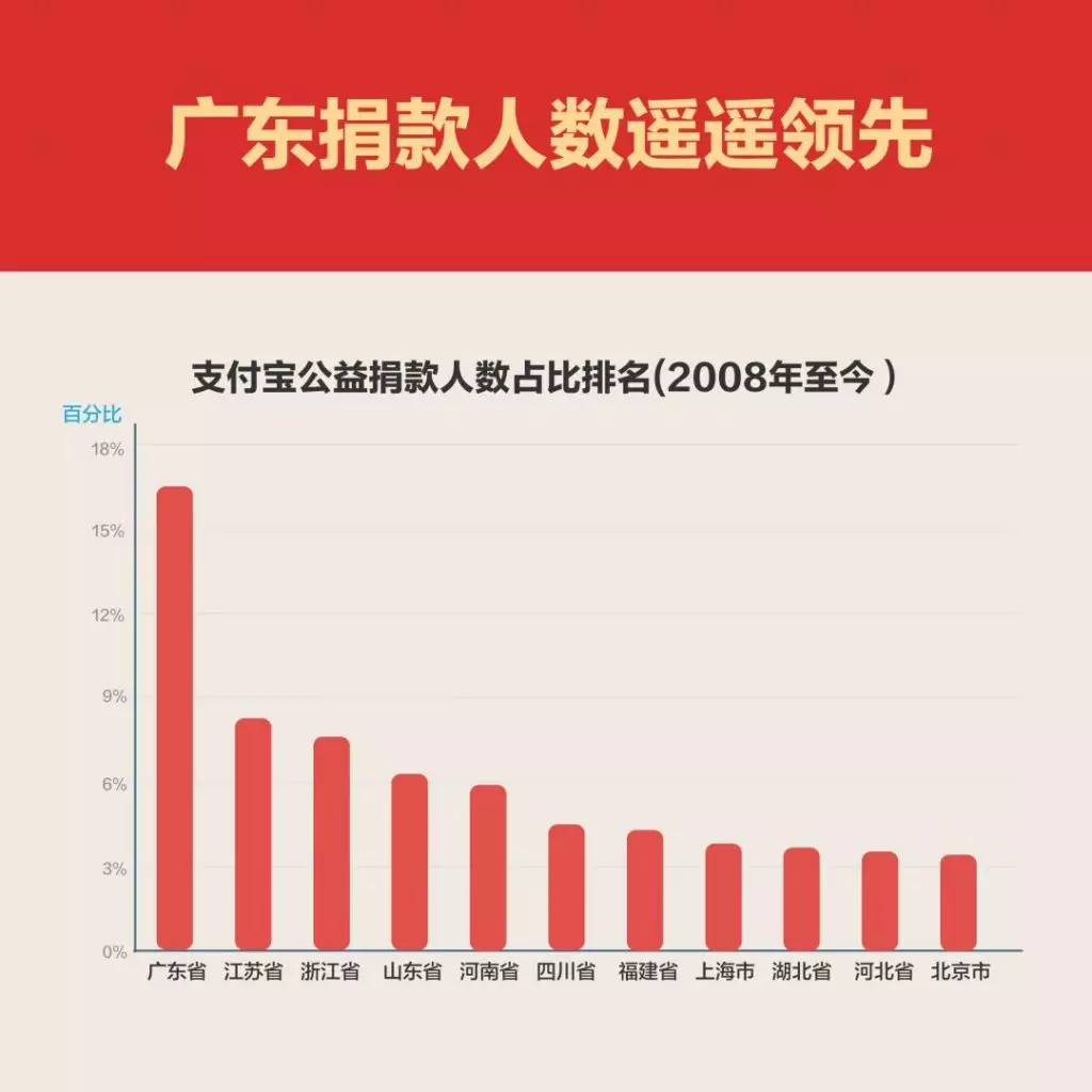 從地區來看,廣東捐款人數遙遙領先,其次是江蘇和浙江。