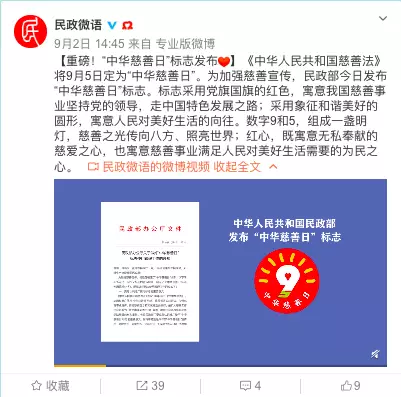 《中華人民共和國慈善法》將每年的9月5日確定為「中華慈善日」,近日,民政部發佈「中華慈善日」標誌。