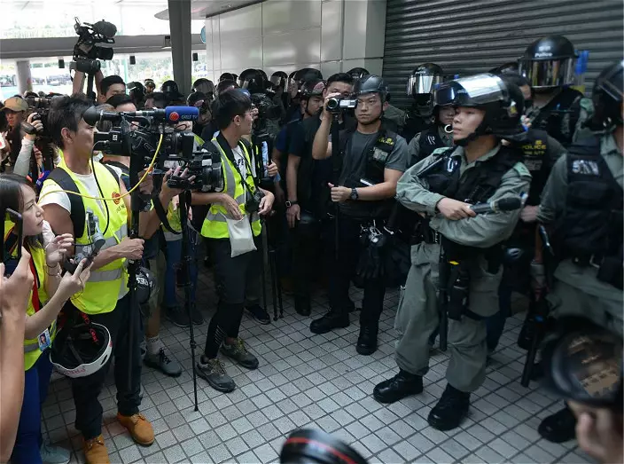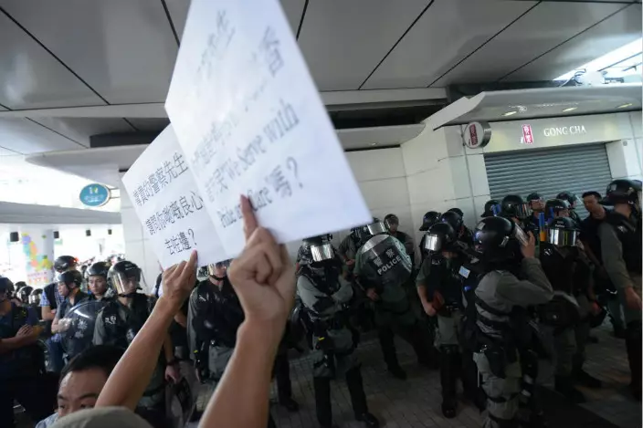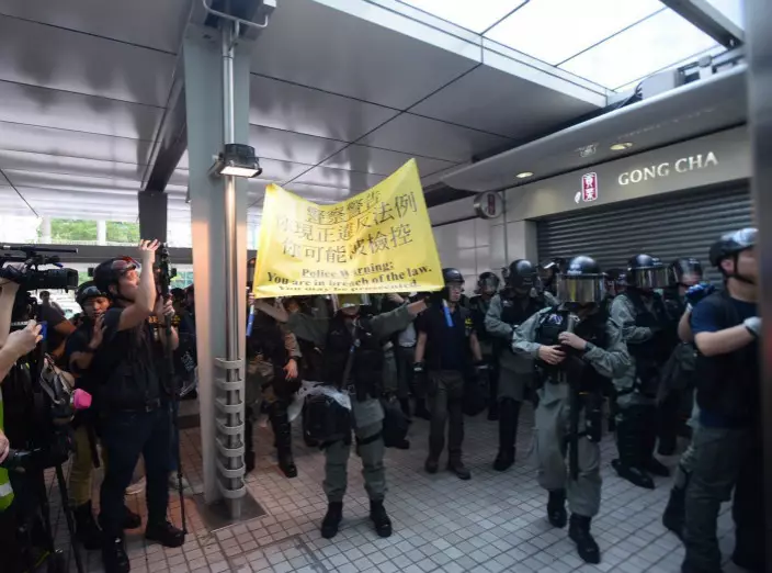 下午4時許,有市民一度與警員對峙,其間有人高叫「殺人犯」及「強姦犯」等。 下午約4時40分,原本在站外戒備,並手持警棍及盾牌的防暴警員一度舉起黃旗,其後向站內方向推進,要求在場人士離開,部分人退向附近的商場。