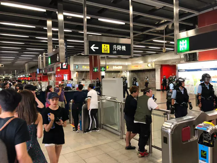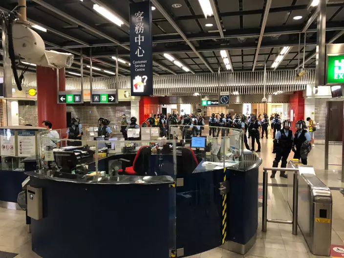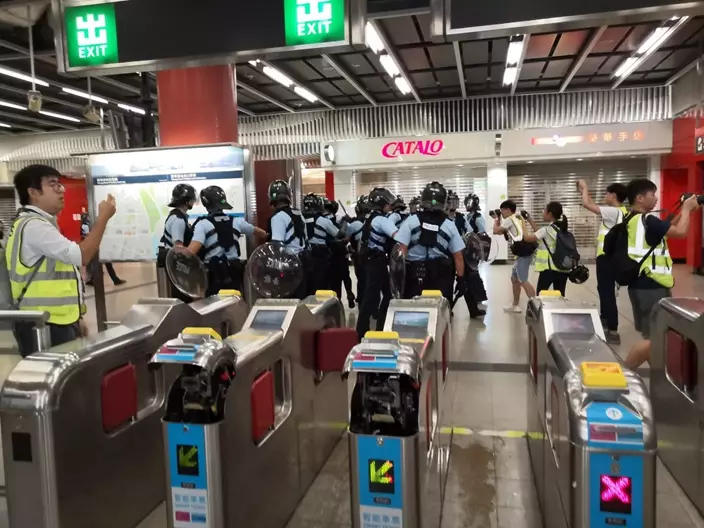 晚上近11時半,手持圓盾,戴上頭盔的警員進入將軍澳站。