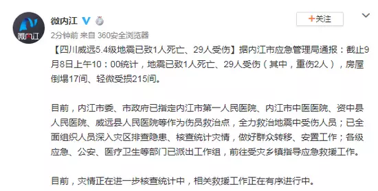 [四川威遠5.4級地震已致1人死亡、29人受傷]據內江市應急管理局通報:截止9月8日上午10:00統計,地震已致1人死亡、29人受傷(其中,重傷2人),房屋倒塌17間、輕微受損215間。