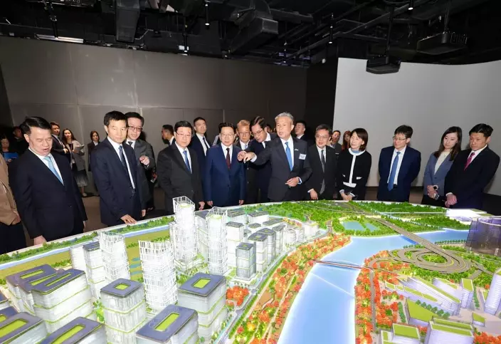 創科園公司行政總裁馬惟善介紹河套香港園區及深圳園區建築,及各項便利措施包括人才公寓、港鐵落馬洲站車費優惠和接駁專車等。李家超FB圖片