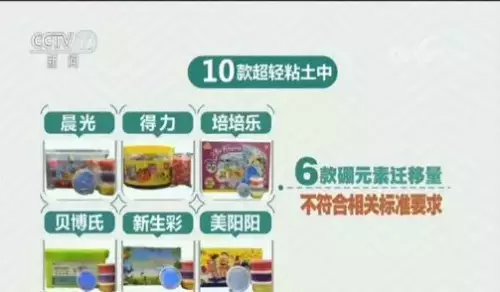 其中,10款超輕黏土中有6款硼元素遷移量被檢出不符合相關標準要求;這六款樣品分別是:標稱晨光、得力、培培樂、貝博氏、新生彩和美陽陽牌超輕黏土。