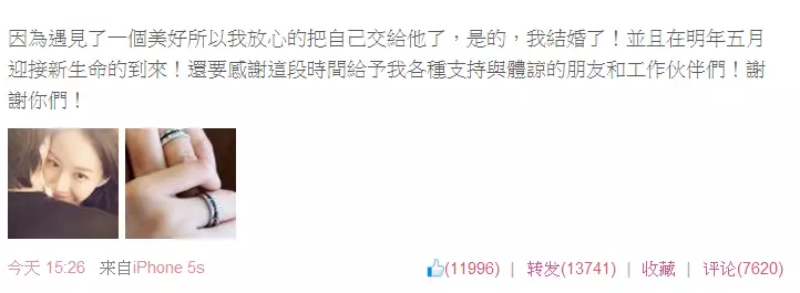 23日下午,久違有消息的曾愷玹突然宣布閃婚:「是的,我結婚了!並且在明年五月迎接新生命的到來!要感謝這段時間給予我各種支持與體諒的朋友和工作伙伴們!」