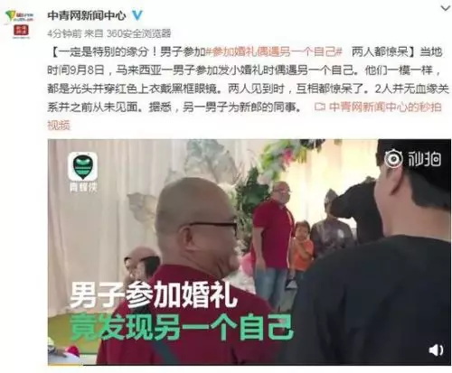 當地時間9月8日,馬來西亞一男子參加發小婚禮時偶遇另一個自己。他們一模一樣,都是光頭並穿紅色上衣戴黑框眼鏡。兩人見到時,互相都驚呆了。2人並無血緣關係並之前從未見面。據悉,另一男子為新郎的同事。