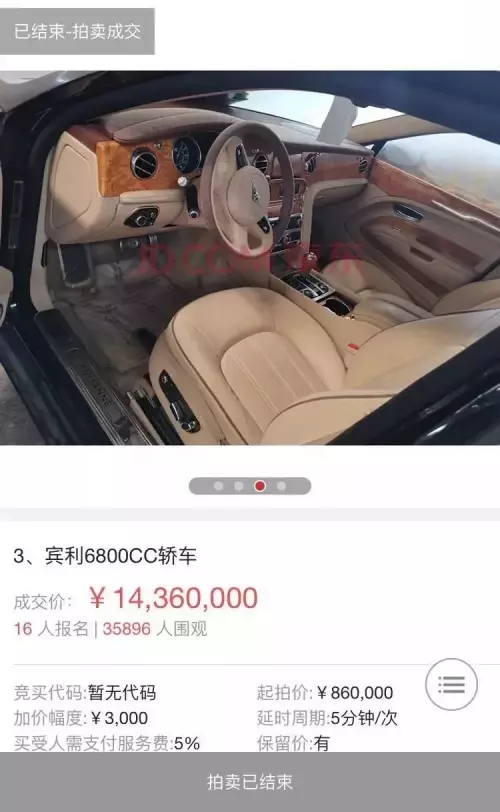 這起網路拍賣於今年8月5日進行,標的物是一輛二手賓利轎車,起拍價是86萬元,由拍賣公司進行拍賣。當天21時結束,共有159次出價記錄。