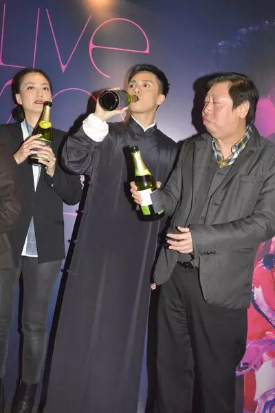 英皇高層吳雨亦送上一對巨胸型壽包,預祝軒仔2月1日生日,軒仔分別回贈鑽拳套及皮鞭回禮。對於一身唐裝造型,軒仔笑言希望2015年大展拳腳,就以「一代中醫」造型出現。