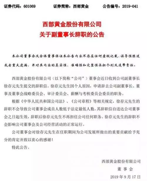 值得一提的是,9月17日,西部黃金股份有限公司董事會發佈公告稱,西部黃金股份有限公司董事會近日收到公司副董事長徐存元先生提交的辭職信。徐存元先生因個人原因,申請辭去公司副董事長、董事及董事會戰略委員會、審計委員會、薪酬與考核委員會委員的職務。