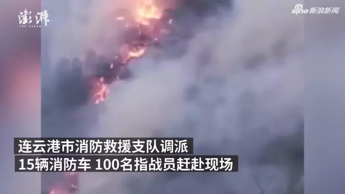 據江蘇省消防救援總隊官方微博消息,周日下午5時12分,連雲港市花果山發生火災。連雲港市消防救援支隊調派15輛消防車、100名指戰員趕赴現場,江蘇省消防救援總隊又調派了300名指戰員攜帶400颱風力滅火機趕赴增援。據了解,現場為花果山小村北側山上發生火災,燃燒區域山勢陡峭,風勢較大。