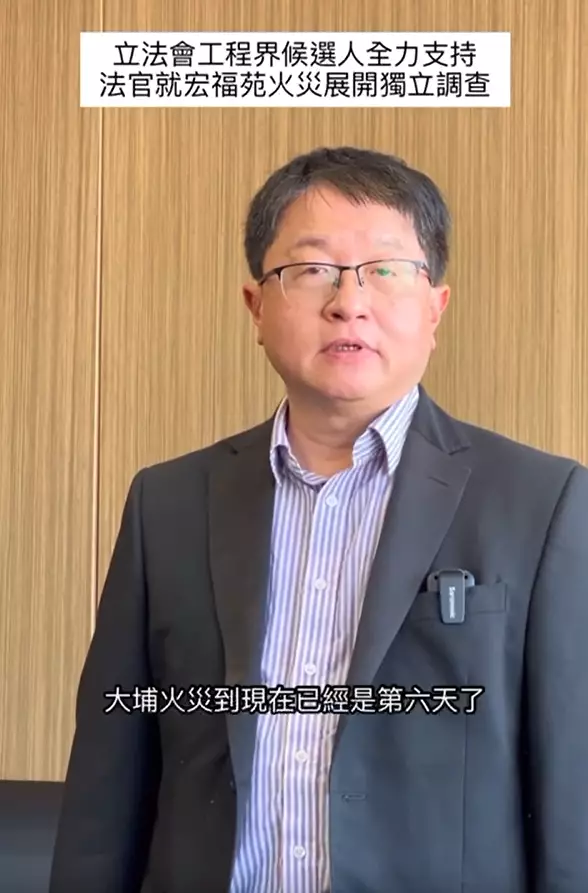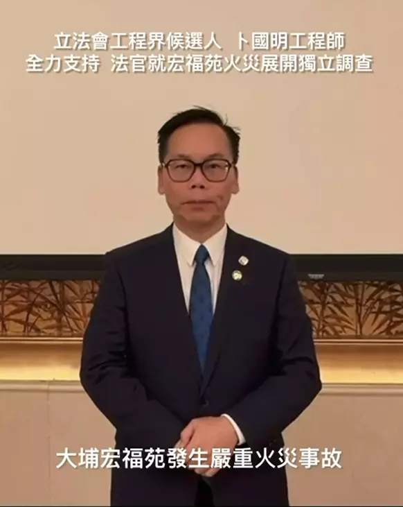 行政長官李家超就大埔宏福苑火災事故宣布成立一個由法官主持的獨立委員會,立法會功能界別工程界候選人霍偉棟及卜國明日前拍片支持,並稱如當選將全力配合政府的調查及改革工作。
