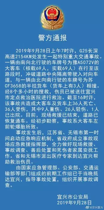 宜興市警方於當日中午曾發通報,指事故造成6人死亡、8人受傷。今日凌晨,宜興市公安局再發佈通報,稱經當局8個多小時的搜救,傷者已全被送往宜興市定點救治醫院救治。事故增至36人死亡、36人受傷。其中有9人重傷、26人輕傷,另有1人已經出院。經當局初步調查顯示,事故證實是因旅遊巴左前輪爆胎所致。