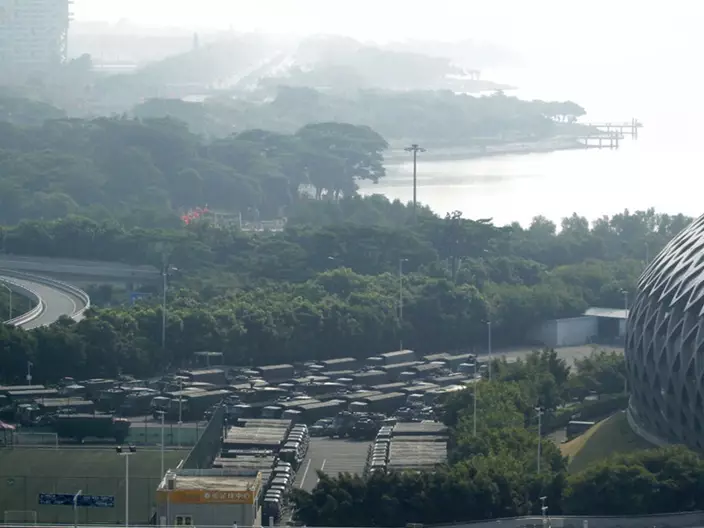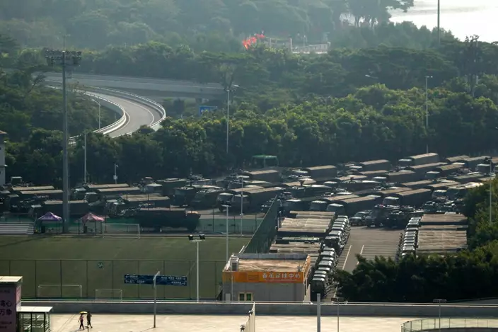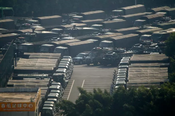 數十軍車停泊深圳灣。AP圖片