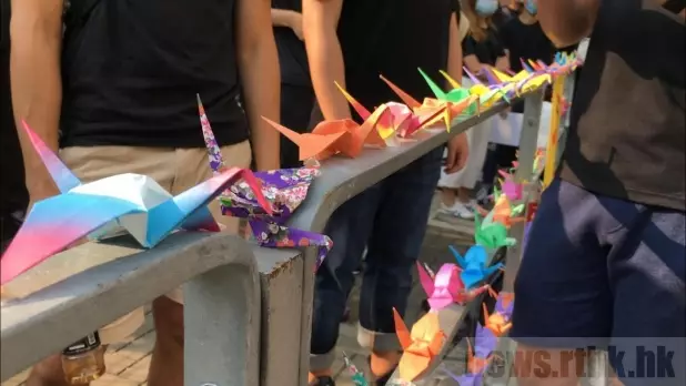 舊生在學校門外摺紙鶴,希望中槍同學能夠平安。(賴頌軒攝)